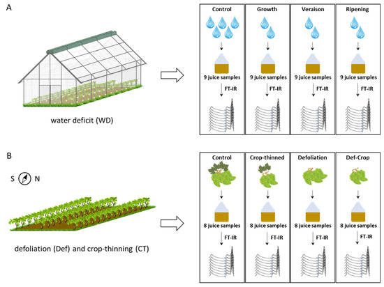 Experimental design. The experiment consisted of two independent trials, one performed in an open screenhouse (A) and the other in a conventional field vineyard (B) (Schemes S1 and S2). The open screenhouse trial was based on water deficit (WD) studies while the field study looked at the effects of viticultural practices, namely defoliation (Def) and crop reduction (CT). Juice samples (8 per treatment in the vineyard and 9 per treatment in the open screenhouse) were produced from grapes collected from both experiments and then analyzed by Fourier Transform-Infrared Spectroscopy (FT-IR, WineScan, FOSS Analytical A/S, Hillerød, Denmark).