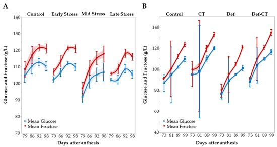 Development during ripening in glucose and fructose in water stress (A) and field (B) trials. Keys: ‘Control’ = no treatment; ’CT’ = crop-thinning; ‘Def’ = defoliation; ‘Def-CT’ = defoliation and crop-thinning. Vertical bars show the 95% confidence intervals. Shaded areas indicate 95% confidence of fit (spline function).