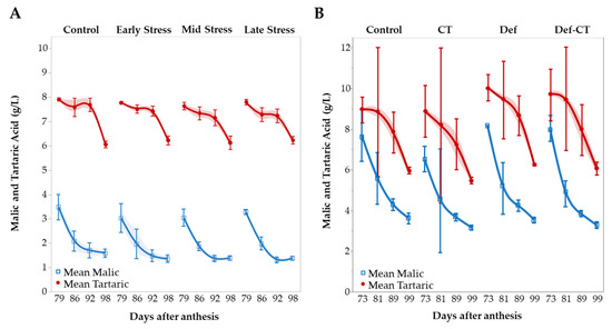Development during ripening in tartaric and malic acid in water stress (A) and field trials (B). Keys: ‘Control’ = no treatment; ‘CT’ = crop-thinning; ‘Def’ = defoliation; ‘Def-CT’ = defoliation and crop thinning. Vertical bars indicate 95% confidence intervals. Shaded areas indicate 95% confidence of fit (spline function).