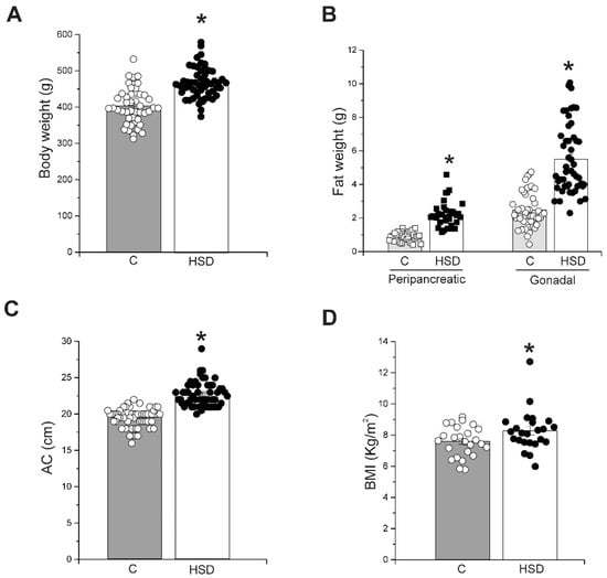 Additionally, the abdominal circumference (AC) and the body mass index (BMI) were analyzed; both obesity-associated parameters were increased in animals with the HSD group. AC increased from 19.4 ± 0.1 cm in the control group to 22.7 ± 0.2 cm in the HSD group (Figure 1C). The HSD group showed a higher BMI compared to the control group (8.5 ± 0.2 and 7.2 ± 0.2 and kg/m2, respectively; Figure 1D).