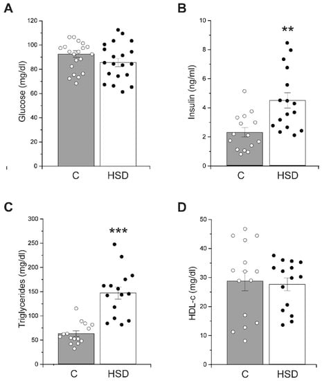 Metabolic status. (A) Fasting glucose levels of HSD group compared to the control group. Boxes around the mean represent SE and whiskers represent the SD, n = 20 of each condition. (B) Plasma insulin levels from control (n = 15) and HSD (n = 15) groups. Boxes around the mean represent SE and whiskers represent the SD. One-way ANOVA was performed with post hoc Tukey’s test, ** p < 0.0001 compared to the control group. (C) Plasma triacylglycerols levels from control (n = 15) and HSD group (n = 15). Boxes around the mean represent the SE, and whiskers represent the SD. One-way ANOVA was performed with post hoc Tukey’s test, *** p < 0.01 compared to the control group. (D) High-density lipoprotein cholesterol (HDL-c) from control group (n = 15) and HSD group (n = 15). Boxes around the mean represent SE and whiskers represent the SD.