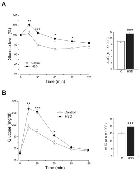 We performed an insulin tolerance test (ITT) and glucose tolerance test (GTT) in fasted rats for 12 h to assess insulin resistance. After an intraperitoneal dose of insulin (0.2 IU/kg of body weight), we quantified the blood glucose at different time intervals. HSD rats showed higher glucose levels than control rats during almost the entirety of the experiment (15 to 90 min). We also quantified the area under the curve (AUC), which was higher in HSD rats than in control rats (Figure 3A). In the GTT, an intraperitoneal glucose dose (2 g/kg of body weight) produced similar behavior. HSD rats showed a maximum peak at 15 min and higher glucose levels than control rats until 60 min. The AUC from HSD rats was higher than that of control rats (Figure 3B). Both tests showed that HSD induces insulin resistance.