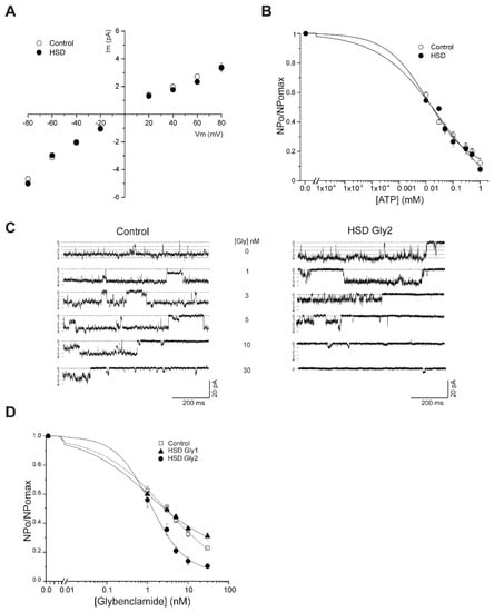 We assessed the ATP-sensitivity of KATP channels in excised patches from control and HSD pancreatic beta cells at −60 mV membrane potential. We used increasing ATP concentrations (0.01, 0.03, 0.05, 0.1, 0.3, 0.5 and 1 mM), which were added to the high potassium solution, to perfuse the intracellular surface of the KATP channels. KATP channel activity (NPo) was reduced with increasing ATP concentrations, and data were adjusted to the Hill equation. We did not observe a difference in the half-maximal inhibitory concentration (IC50) of ATP, 17.4 ± 0.04 and 18.1 ± 0.001 µM to control and HSD groups, respectively. Moreover, the Hill coefficients were 0.5 ± 0.04 and 0.5 ± 0.07 to control and HSD groups, respectively (Figure 4B).