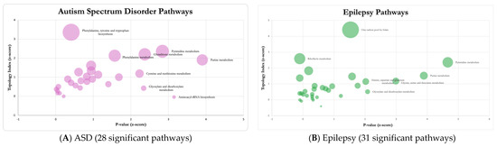 Prominent pathways for the ASD group (Figure 2A) include purine metabolism [pz = 3.90, Topoz = 1.91], aminoacyl-tRNA biosynthesis [pz = 3.15, Topoz = −0.04], pyrimidine metabolism [pz = 2.74, Topoz = 2.36], glutathione metabolism [pz = 2.37, Topoz = 2.20], glyoxylate and dicarboxylate metabolism [pz = 2.34, Topoz = 0.43], cysteine and methionine metabolism [pz = 2.23, Topoz = 1.19] and phenylalanine metabolism [pz = 1.57, Topoz = 2.13]. Prominent pathways for the EPI group (Figure 2B) include pyrimidine metabolism [pz = 4.66, Topoz = 2.36], purine metabolism [pz = 3.89, Topoz = 1.52], glycine, serine and threonine metabolism [pz = 2.99, Topoz = 1.18], glyoxylate and dicarboxylate metabolism [pz = 2.08, Topoz = 0.51], alanine, aspartate and glutamate metabolism [pz = 2.02, Topoz = 1.15], one-carbon pool by folate [pz = 1.53, Topoz = 4.41] and riboflavin metabolism [pz = −0.11, Topoz = 2.59]. Prominent pathways for the DD group (Figure 2C) include purine metabolism [pz = 4.70, Topoz = 1.51], pyrimidine metabolism [pz = 4.25, Topoz = 2.34], glycine, serine and threonine metabolism [pz = 2.67, Topoz = 1.09], glyoxylate and dicarboxylate metabolism [pz = 2.47, Topoz = 0.51], one-carbon pool by folate [pz = 0.93, Topoz = 4.07] and vitamin B6 metabolism [pz = 0.18, Topoz = 2.11].