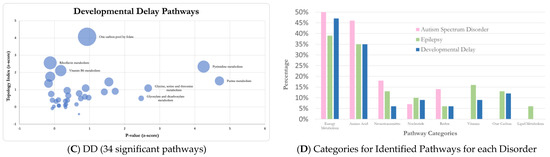Major Nodes for Metabolite–Metabolite Interaction Networks for (A) Autism Spectrum Disorder (ASD), (B) epilepsy (EPI) and (C) Developmental Delay (DD) as well as (D) Categories for Pathways Identified for each Disorder.