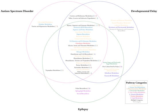 Figure 3 depicts the overlap of the metabolic pathways identified for the various neurodevelopmental groups. As can be seen in Figure 3, many pathways overlap for all three disorders, predominately energy, amino acid and neurotransmitter metabolism. Other pathways are shared by two or more disorders. Amino acids important in energy, one-carbon and redox metabolism are shared by ASD and DD, while ASD and EPI share tryptophan, an essential α-amino acid important in the production of the neurotransmitter serotonin, the hormone melatonin and the vitamin niacin. Interestingly, shared between DD and EPI are multiple vitamin pathways including folate, riboflavin and pyridoxine metabolism. DD showed exclusive relation to nicotinamide metabolism. Each disorder has exclusive association with specific pathways. ASD is exclusively related to the glycolipid, histidine and taurine/hypotaurine metabolism. EPI is exclusively related to sphingolipid and steroid metabolism, while DD is exclusively related to non-mitochondrial carbohydrate metabolism.