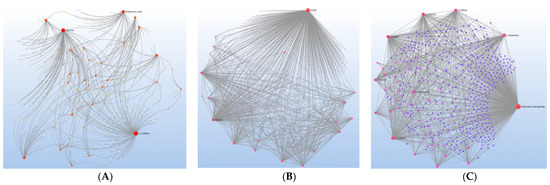 Major Nodes for Metabolite–Metabolite Interaction Networks for (A) ASD, (B) epilepsy (EPI) and (C) DD.