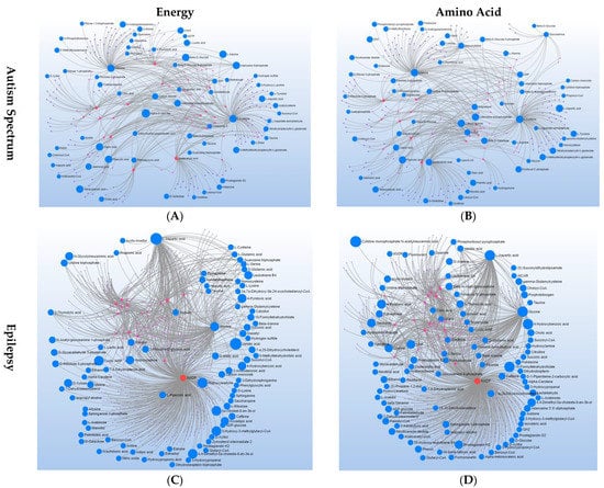 Similar to energy pathways, the metabolite–metabolite interaction networks for amino acids demonstrate the unique nature of amino acid metabolism in each disorder. For ASD, there are three major metabolites (Figure 5B): L-cysteine is connected to either amino acid precursors (homocysteine) or transsulfuration metabolites (e.g., L-cystine and L-cystathionine) involved in the production of glutathione (GSH); adenine is associated with other purines; dodecanoic acid is related to other medium-chain fatty acids. Similar to the pattern seen for energy metabolism, for EPI, metabolite connections to NADP are linked because NADP is an important cofactor for reactions that produce the metabolites (Figure 5D). Additionally, like the pattern seen for energy metabolism, for DD, the connection of other metabolites to ATP is through support of mitochondrial function to produce ATP.