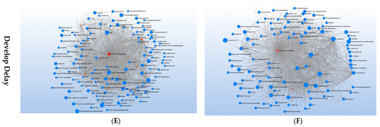 Figure 4 depicts the overall metabolite–metabolite interaction for each disorder with the major nodes highlighted to depict the major metabolic drivers of the networks. For ASD, the major nodes consist of L-cysteine, adenine and dodecanoic acid. For EPI, the major node was nicotinamide adenine dinucleotide phosphate (NADP), with glycine as a slightly smaller node. For DD, adenosine triphosphate (ATP) was the major node, with several amino acids as slightly smaller nodes, including L-glutamine, L-cysteine, citrulline L-lysine, L-arginine and ornithine.