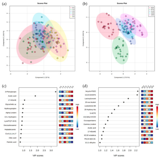 Figure 1. (a) PLS−DA of HF heifers between 0.5 and 3.0 months of age. (b) PLS−DA of HF heifers between 0.5 and 19.0 months of age. (c) VIP score plots produced by PLS−DA of metabolites with a VIP score >0.75 in HF heifers between 0.5 and 3.0 months of age to allow the visualization of metabolites whose values were close to 1. (d) VIP score plots produced by PLS−DA of metabolites >1.0 in HF heifers between 0.5 and 3.0 months of age. All in the combined ionization mode m/z.
