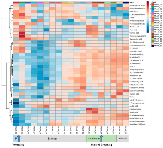 Figure 4. HCA of the major metabolite changes differentiating between HF heifers between 1 and 19 months of age in the combined ionization mode m/z. Changes in diet and/or environment are labelled accordingly, for example, P* = pre-weaning.