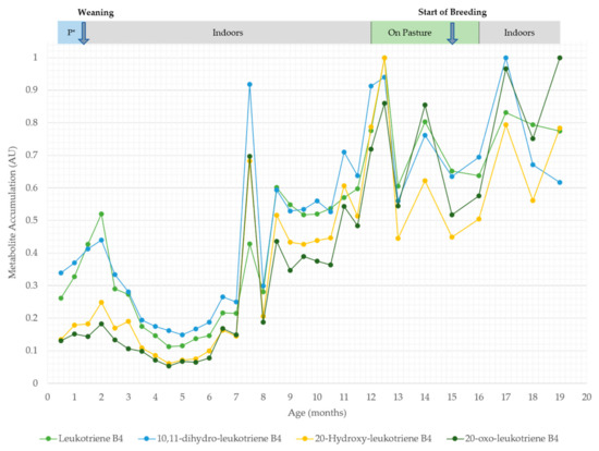 Then, m/z ratios, which differed significantly (p-values < 0.05, adjusted for FDR) between experimental classes, were targeted by time series analyses. The m/z ratios were identified and displayed using two heatmaps that displayed changes in the pre- and post-rumen development phases. Of the 30 metabolites identified between 2 weeks and 3 months of age, 20 metabolites displayed a peak in accumulation between 1.5 and 2.0 months of age (Figure 2) and changes in fatty acyl class metabolites were prominent (Table 1). Considering these in greater detail, the metabolites belonged to the following subclasses (number of metabolites): fatty acids and conjugates (11), linoleic acids and derivatives (4), eicosanoids (3) and fatty amides (1) (Table 1). Considering, metabolomic changes occurring post-rumen development, time series analyses targeted 40 metabolites (Figure 3). Of these, 22 metabolites increased, 13 decreased and 5 fluctuated with no clear pattern over time. Most of the metabolites were again fatty acyls (Figure 3), belonging to the following subclasses (number of metabolites): fatty acids and conjugates (15), eicosanoids (8) and linoleic acids and derivatives (4) (Table 1). Of the identified metabolites, 25 were also identified within 2 weeks to 3 months of age in the time series analysis (Table 1). Leukotriene-related metabolites (leukotriene B4, 10,11-dihydro-leukotriene B4, 20-hydroxy-leukotriene B4 and 20-oxo-leukotriene B4) generally increased over time but showed noticeable accumulation peaks at 2.0, 7.5, 12.5 and 17.0 months of age (Figure 4). The initial peak at 2.0 months of age broadly corresponds to weaning at approximately 6 weeks of age. Meanwhile, the peaks at 12.5 months and 17.0 months of age coincide with environmental and dietary changes. However, the underlying reason behind the isolated peak at 7.5 months remains unknown; it may be a technical anomaly, as it does not correlate with any known experimental variables. In line with this, pathway assessments based on MSEA using ORA indicated that only alpha-linolenic acid and linoleic acid metabolism significantly changed in pre- and post-weaning analyses (Figure S3).
