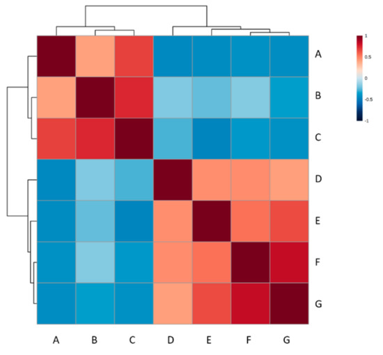 Figure 5. A heatmap of the Pearson’s correlation coefficients produced by comparing liveweight (kg) at 3.0 months of age and metabolites significantly affected by time between 2 weeks and 3 months of age, whereby −0.4 < correlation co-efficient > 0.4. Positive correlations are shown in red; negative correlations are shown in blue. A = liveweight (kg), B = 3-phenylpropionate, C = acetic acid, D = dehydroisoandrosterone 3-glucuronide, E = hydroxypropionic acid, F = 13-L−Hydroperoxylinoleic acid, G = docosapentaenoic acid.