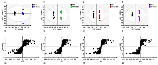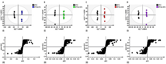 Orthogonal projection to latent structures discriminant analysis (OPLS-DA) modelling of Arabidopsis WT leaf extracts (ESI (−) data). (A–D) (i) represent OPLS-DA score plots showing clear separation between control vs. LPSPst treatment after 0, 12, 18, and 24 h, respectively. (A–D) (ii) represent OPLS-DA loading S-plots showing the discriminant features (ions) responsible for the sample grouping observed in (A–D) (i). The OPLS-DA model parameters were: (A) R2X = 46.2%/Q2 = 97.4%, (B) R2X = 53.6%/Q2 = 98.3%, (C) R2X = 60.9%/Q2 = 98.9%, (D) R2X = 64.2%/Q2 = 98.9%, respectively. The variables in the top right quadrants of the S-plots correlated positively to the treatment. Selected discriminant ions for downstream metabolite identifications were based of a correlation [p(corr)] of ≥ 0.5 and covariance of (p1) ≥ 0.05. The equivalent set of figures for the ESI (+) mode is presented as Figure S3.