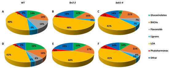 LPS-induced discriminant metabolite classes identified in Arabidopsis WT and mutant (lbr2-2 and bak1-4) lines (Table 1). (A–C) represents discriminant metabolites from LPSPst-treated WT, lbr2-2 and bak1-4, respectively. (D–F) represents discriminant metabolites from LPSXcc -treated WT, lbr2-2 and bak1-4, respectively. These metabolites contribute to the defence response in Arabidopsis WT and mutants. Abbreviations: BHCAs = benzoic- and hydroxycinnamic acid derivatives; LOA = lipids, oxylipins and arabidopsides.