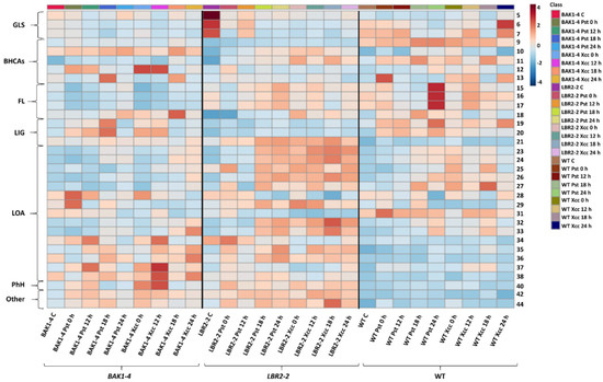 Significant metabolites from LPS-induced Arabidopsis WT, lbr2-2 and bak1-4 were submitted to the colour-coded heat map module in the MetaboAnalyst web-based tool, to visualise and analyse the time course of relative intensities across control, 0, 12, 18, and 24 h. Notably, the heat maps display the relative intensities of the annotated metabolites across all time points. In the constructed heat maps (Figure S6 for ESI (+) data and Figure 5 for ESI (−) data), the rows represent the group of the identified metabolites, while the columns represent Arabidopsis plants with their respective LPS chemotype time-related treatments. The colour gradient of dark blue indicates the lowest concentration (relative peak intensity), while deep red indicates the highest concentration. In this study, the annotated metabolites showed a variation of metabolite accumulation as displayed by the average relative intensities (blue and red colour gradient). For the ESI (+) data, high intensities were observed within the lbr2-2 (toward the middle and lower sections for both LPS chemotypes), followed by the bak1-4 (towards the left for LPSPst and towards the right for LPSXcc), and finally to the WT (right side of the heat map). The metabolites on the top half of WT showed higher intensity (mainly glucosinolates) than the bottom, while in the lbr2-2, the bottom half (mainly the LOA and other metabolites) were more intense than the top half (and clearly so compared to the WT), whereas in the bak1-4, intensities were relatively equal in the top and bottom half (Figure S6). Metabolites identified from WT treated with LPSPst appeared to have late increases in intensities compared to the plants treated with LPSXcc that displayed early intensity increases (Figure S6). A similar pattern was observed in the lbr2-2 and bak1-4 plants, but with higher increased intensities. For the ESI (−) data, similar trends were observed where metabolites on the top half (mainly glucosinolates, benzoic acid and HCA derivatives and flavonoids) of WT had higher intensities than the bottom half. In lbr2-2, the bottom half (mainly the LOA, phytohormones and other metabolites) was higher in intensity than the top half, and notably so compared to the WT. Finally, in the bak1-4, relatively similar intensities were observed on the top and bottom half of the heat map (Figure 5).
