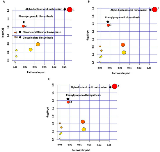 Metabolome view of metabolic pathways (MetPA) mapped from identified metabolites. Metabolite KEGG IDs from both LPS chemotype-treated WT, lbr2-2 or bak1-4 were mapped to pathways as displayed. (A–C) represents the metabolome view for the WT, lbr2-2 and bak1-4, respectively. The graphs were arranged such that the p-values from the pathway analysis are on the y-axis and the impact values from the pathway topology analysis on the x-axis. The colour gradient of the circles (pathways) from light yellow to dark red indicates lower to higher significance, respectively. Pathways are numbered #1: Alpha-linolenic acid metabolism, #2: Phenylpropanoid biosynthesis, #3: Flavone and flavanol biosynthesis and #4: Glucosinolate biosynthesis. Notably, pathways #3 and #4 were not mapped in the lbr2-2 and bak1-4 mutants.