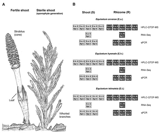 Multi-omics analysis of Equisetum samples. (A) Sketch of a fertile and sterile shoot. (B) Experimental design. Abbreviations: E.a., Equisetum arvense; E.h., Equisetum hyemale; E.t., Equisetum telmateia; HPLC–QTOF-MS, high-performance liquid–quadrupole time-of-flight mass spectrometry; RT-qPCR, quantitative real-time polymerase chain reaction; R, rhizome; RNA-Seq, next-generation ribonucleic acid sequencing; Rpl, replicate; S, shoot.