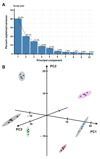 Separation of Equisetum sample groups based on a principal component analysis (PCA) of metabolomics data. (A) Scree plot indicating that the first three principal components (PCs) explain 74% of variance across datasets. (B) Three-dimensional PCA plot visualizing the separation of samples from Equisetum arvense shoots (red pyramids), Equisetum arvense rhizomes (black spheres), Equisetum hyemale shoots blue cubes), Equisetum hyemale rhizomes (green cubes), Equisetum telmateia shoots (magenta pyramids), and Equisetum telmateia rhizomes (teal spheres).