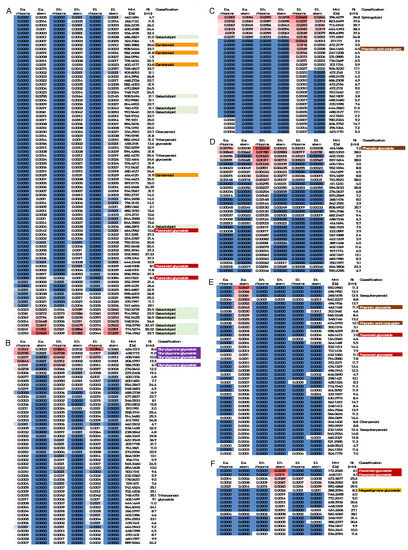 Classification of molecular features contributing most strongly to Equisetum sample group separation in PCA, organized by patterns of accumulation: (A) highly positive PC1 scores; (B) strongly negative PC1 scores; (C) highly positive PC2 scores; (D) strongly negative PC2 scores; (E) highly positive PC3 scores; (F) strongly negative PC3 scores. Abbreviations: E.a., Equisetum arvense; E.h., Equisetum hyemale; E.t., Equisetum telmateia; m/z, mass-to-charge ratio; Rt, retention time.