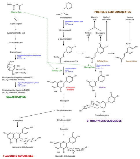 Representative structures of the main classes of specialized metabolites detected in Equisetum samples and outline of the relevant biochemical pathways. Enzymes selected for follow-up research (by assessing the expression levels of the corresponding genes) are shown in blue font.