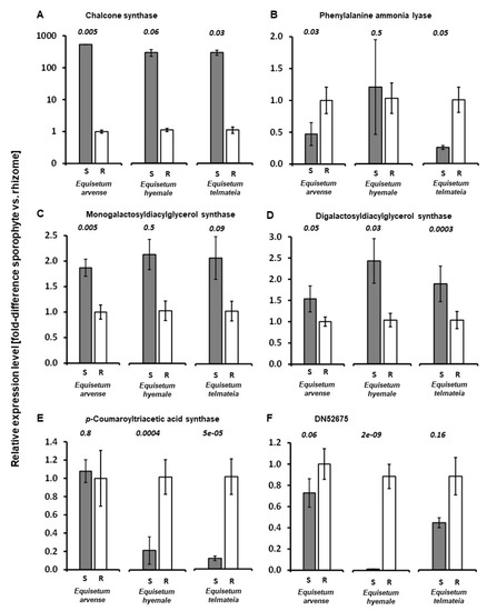 RT-qPCR analysis of expression patterns of selected genes (expressed as fold-change of shoot (gray column) versus rhizomes (white column); standard errors shown as bars): (A) chalcone synthase; (B) phenylalanine ammonia lyase; (C) monogalactosyldiacylglycerol synthase; (D) digalactosyldiacylglycerol synthase; (E) p-coumaroyltriacetic acid synthase; (F) transcript corresponding to the sequence of contig DN52675 (obtained during assembly of RNA-Seq data for E. telmateia rhizomes). Abbreviations: S, shoot; R, rhizome. The p-values obtained with a two-tiered Student’s t-test are shown in italics (comparison shoot versus rhizome for each species).