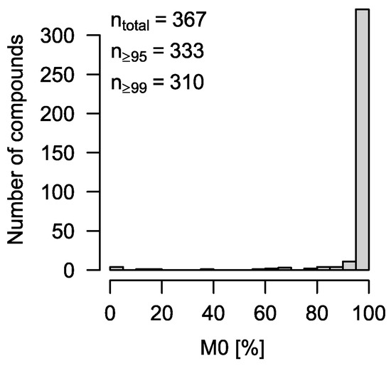 Histogram of estimated M0 for 367 library spectra. Ideally, all compounds are M0 = 100%. However, due to spectral impurities, this is only true for 288 compounds, or 78%. Still, more than 90% of all compounds (n = 333) show an automatic solution with M0 ≥ 95%.