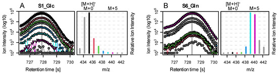 Base peak chromatogram (BPC, left) and rawMID (right) for two example files from the biological data set. For both samples, we show the Gln peak: (A) after 24 h of Glc labelling and (B) after 24 h of Gln labelling. The rawMIDs are extracted from the respective BPC scan indicated by a vertical grey line. BPCs, and their corresponding rawMID relative intensities are color coded as follows: black indicates [M+H]+; red, green, blue, light blue, and purple indicate [M+H]++1 to 5; and grey indicates [M-H]+, [M]+, and [M+H]+6/7. Absolute intensities in BPCs are depicted in log10-scale, and rawMIDs are normalized relative to the highest ion peak in the MID. In sample S1 (Glc as tracer and Gln putatively non-labeled), we observe that the [M+H]+ ion (black) shows the highest ion abundance. However, the rawMID represents an overlay of the MIDs of three adducts: [M-H]+, starting at m/z~433; [M]+, starting at m/z~434 (both grey); and [M+H]+, starting at m/z~435 (black). In consequence, the peak intensity at m/z~435 is actually the sum of three isotopes: [M-H]++2, [M]++1, and [M+H]++0. In sample S6 (Gln as tracer and putatively fully labeled), we observe a clear shift in the MID by 5 mass units towards the right (caused by five 13C labeled carbon atoms in Gln). However, to estimate the correct amount of labelling, we need to consider tracer impurity, natural abundance of Gln, as well as the C and Si atoms introduced by silylation and three relevant fragments (adducts).