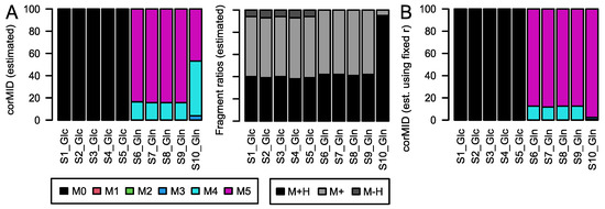 corMID and fragment distribution r for Gln after Glc labeling (S1–5) and after Gln labeling (S6–10). (A) corMID and r estimated from the measured intensities. (B) corMID estimated using the median values from (A) as a fixed r. The according rawMIDs for all files can be found in Figure S4.