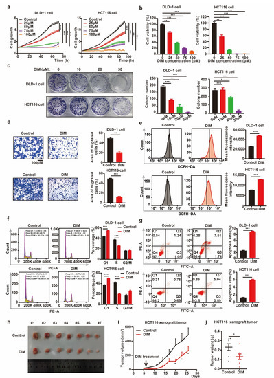Previous studies have shown that DIM exerts antitumor effects in different cancer types, including CRC [17,26]. To further investigate the potential antitumor mechanisms of DIM, we treated CRC cells with different concentrations of DIM. The cell growth curves obtained by IncuCyte analysis and cell viability from CCK-8 assay indicated that DIM reduced the viability and proliferation of CRC cells compared with control cells in a dose-dependent manner (Figure 1a,b). Consistent with the growth curves, DIM treatment resulted in an inhibitory effect on colony formation, while the sensitivity of CRC cell lines to DIM varied (Figure 1c). In addition, the role of DIM in cell migration was analyzed using transwell assays. The results suggested that CRC cell migration was inhibited by DIM compared to the control group (Figure 1d). In this study, flow cytometry was performed to calculate the ROS level. The results showed that DIM treatment led to an increase in the production of ROS (Figure 1e). Moreover, propidium iodide (PI) staining was conducted to evaluate the impact of DIM on the cell cycle phase distribution. The results showed that DIM induced G1 arrest in DLD-1 cells and HCT116 cells (Figure 1f). In addition, DLD-1 cells and HCT116 cells were treated with DIM for 48 h, and Annexin V-FITC/PI staining was performed to determine the effect of DIM on apoptosis. Flow cytometric analysis revealed that DIM induced apoptosis in both DLD-1 and HCT116 cells (Figure 1g).