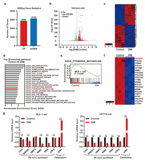 The potential molecular mechanisms of DIM were studied by mRNA sequencing and analysis of differentially expressed genes (DEGs). We treated DLD-1 cells with medium containing DIM and profiled their gene expression. Analysis of gene expression after DIM intervention revealed that DIM changed the gene expression profile; in total, 2850 genes were upregulated, and 3134 genes were downregulated (Figure 2a). The heatmap and volcano plot helped to visualize the DEGs and identified different signatures (Figure 2b,c). We further performed gene set enrichment analysis (GSEA), a computational approach to determine the biological difference between groups. The top 20 pathways significantly enriched with numerous DEGs in each biological process are listed in Figure 2d. The pyrimidine metabolism pathway was enriched in the control group (Figure 2e). The top 20 genes in the “KEGG_PYRIMIDINE_METABOLISM” pathway are also listed (Figure 2f). Furthermore, the expression levels of some genes related to pyrimidine metabolism were confirmed by real-time PCR. DIM inhibited the expression of genes associated with pyrimidine synthesis, while the expression of the pyrimidine-catabolism-associated gene UPP1 was increased (Figure 2g). Taken together, these results indicate that DIM treatment induces disruption of pyrimidine metabolism.