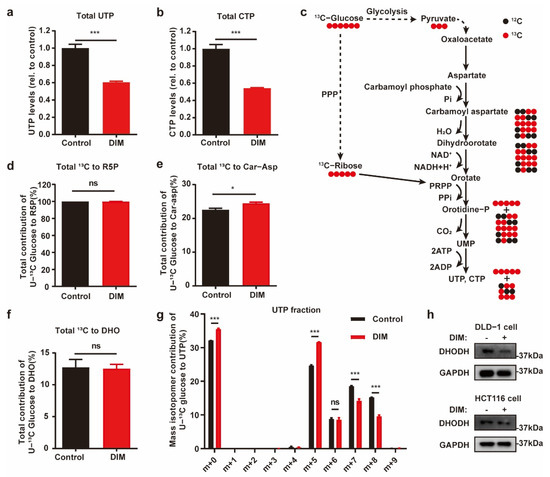 To confirm whether pyrimidine synthesis is blocked by DIM treatment in CRC, we analyzed the total contents of UTP and CTP by using mass spectrometry. Following DIM treatment, the total contents of UTP and CTP in HCT116 cells were decreased (Figure 3a,b). Furthermore, we performed 13C-glucose tracing to compare the metabolite profiles of control and DIM-treated HCT116 cells. A schematic overview of de novo pyrimidine synthesis and the use of 13C-labeled glucose to monitor pyrimidine synthesis is shown in Figure 3c. Generally, glucose carbon is incorporated into aspartate, which is condensed with carbamoyl phosphate (Car-Asp) to form dihydroorotate (DHO), which is further oxidized to orotate via dihydroorotate dehydrogenase (DHODH). Glucose carbon is also incorporated into pyrimidine nucleotides via several reactions catalyzed by phosphoribosyl pyrophosphate. Phosphoribosyl pyrophosphate is added to yield orotidine monophosphate, from which UMP, UTP, and CTP are produced.