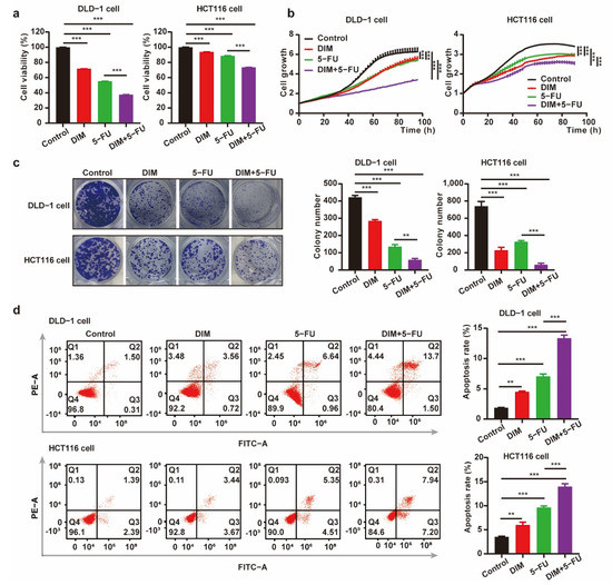 Our objective was to study the synergistic effect of DIM and 5-FU on CRC cytotoxicity. It has been reported that 5-FU targets pyrimidine metabolism. Therefore, we sought to determine whether there is synergism between DIM and 5-FU. We performed combination treatment with 5-FU and DIM in different CRC cell lines. As shown in Figure 4a,b, in comparison to 5-FU or DIM alone, the combination of 5-FU and DIM showed potent inhibitory effects on cancer cell viability and proliferation. Furthermore, CRC cells were treated with the indicated concentrations of 5-FU and DIM alone or in combination for evaluation of colony formation. Consistent with the results of the cancer cell growth assay, the combination of 5-FU and DIM reduced the capacity for colony formation (Figure 4c). Similar results were also observed in the apoptosis assay. Combination treatment with DIM and 5-FU notably increased the number of apoptotic cells, and all results were further quantified (Figure 4d). Collectively, these results indicate that DIM increases the therapeutic effect of 5-FU in vitro.