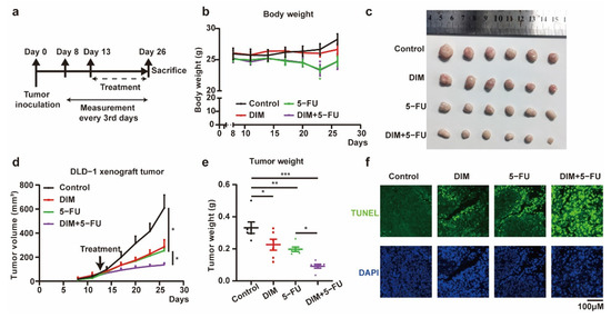To confirm the in vitro findings described above, the synergistic effects of combined treatment with DIM and 5-FU were examined in a mouse xenograft model (Figure 5a). Loss of body weight was observed in the groups that received 5-FU, and DIM had no protective effects on body weight (Figure 5b). The volume and weight of tumors were decreased in the groups that received DIM, 5-FU, or both DIM and 5-FU. Additionally, the therapeutic efficacy of 5-FU was improved by DIM (Figure 5c–e). Subsequently, we determined the apoptosis rate of DLD-1 cells in the tumor mass after different treatments. Single-agent treatment with DIM or 5-FU induced apoptosis, and combination treatment with DIM and 5-FU potentiated the effect of each single agent on apoptosis (Figure 5f). Consistent with the in vitro results, DIM treatment increased the cytotoxic response to 5-FU in CRC xenograft tumors.
