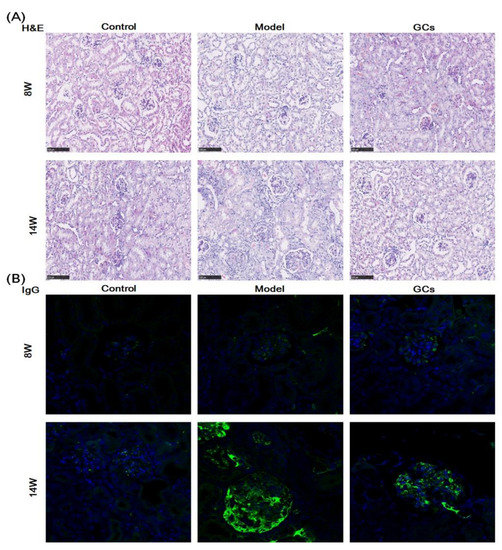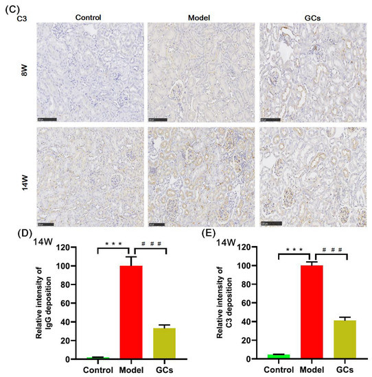 The images of hematoxylin and eosin (H&E) staining showed that in comparison with those of the controls at 14 weeks old, the model group had significant histopathological alterations in kidneys, including mesangial matrix hyperplasia, mesangial cell proliferation, glomerular swelling, and inflammatory cell infiltration (Figure 1A). Meanwhile, the immunofluorescence analysis and the immunohistochemical staining also demonstrated that IgG antibody and C3 deposition in glomeruli were present at the model group at 14 weeks of age, respectively. (Figure 1B,C). To quantitatively confirm histological observations, the intensities of IgG antibody and C3 deposition in glomeruli were determined by quantitative image analysis, respectively. After being normalized to the model group, the results from different groups were displayed in Figure 1D,E. In contrast, these histopathological changes in renal tissue were not significant in the model mice at 8 weeks old (Figure 1).
