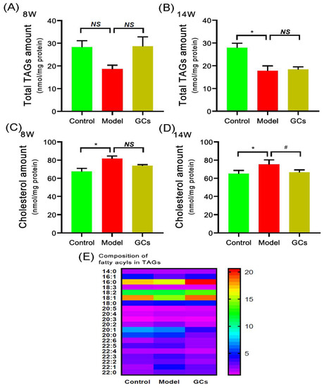 Comparison of the total amount of triacylglycerol species and cholesterol deposited in cardiac tissues from MRL/lpr mice from each group at different states. Heart tissues of the control (n = 4), model (n = 4), and GCs (n = 4) groups were collected at 8 and 14 weeks of age, respectively. Both model and GCs groups were MRL/lpr mice, while the control group was MRL/MpJ mice. Lipidomics analysis of total level of triacylglycerol (TAG) species (Panels A and B), composition of fatty acyls in TAGs (Panel E), and cholesterol level (Panels C and D) present in lipid extracts of heart was performed through multidimensional mass-spectrometry-based shotgun lipidomics. The data represent means ± SEM from different groups. Difference between the groups was determined using ANOVA followed by Dunn multiple comparison with IBM SPSS Statistics 19 Software (SPSS Inc., Chicago, IL, USA) after the normality of each group of variables was checked by Q–Q plots. The raw p values were adjusted to false discovery rat using the Benjamini–Hochberg method. * adjusted p < 0.05 and # adjusted p < 0.05 compared with those in the control group and the model group, respectively. NS, not significant.