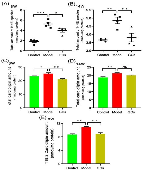 Comparison of total amounts of 4-hydroxyalkenals and cardiolipin species in cardiac tissues from MRL/lpr mice from each group at different states. Heart tissues of the control (n = 4), model (n = 4), and GCs (n = 4) groups were collected at 8 and 14 weeks of age, respectively. Both model and GCs groups were MRL/lpr mice, while the control group was MRL/MpJ mice. Lipidomics analysis of 4-hydroxyalkenal (HNE) species (Panels A and B) and cardiolipin species (Panels C–E) present in lipid extracts of heart was performed through multidimensional mass spectrometry-based shotgun lipidomics. The data represent means ± SEM from different groups. Difference between the groups was determined using ANOVA followed by Dunn multiple comparison with IBM SPSS Statistics 19 Software (SPSS Inc., Chicago, IL, USA) after the normality of each group of variables was checked by Q–Q plots. The raw p values were adjusted to false discovery rat using the Benjamini–Hochberg method. * adjusted p < 0.05, ** adjusted p < 0.01, and *** adjusted p < 0.001 compared with those in the control group. # adjusted p < 0.05 and ## adjusted p < 0.01 compared with those in the model group. NS, not significant.