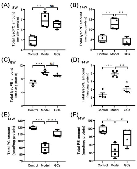 Comparison of the total amounts of lysophospholipid and phospholipid species in heart tissues from MRL/lpr mice from each group at different states. Heart tissues of the control (n = 4), model (n = 4), and GCs (n = 4) groups were collected at 8 and 14 weeks of age, respectively. Both model and GCs groups were MRL/lpr mice, while the control group was MRL/MpJ mice. Lipidomics analysis of lysophospholipid species, including choline lysoglycerophospholipid (lysoPC) and ethanolamine lysoglycerophospholipid (lysoPE) (Panels A–D), and phospholipid species, i.e., choline glycerophospholipid (PC) and ethanolamine glycerophospholipid (PE) (Panels E and F), present in lipid extracts of heart was performed through multidimensional mass-spectrometry-based shotgun lipidomics. The data represent means ± SEM from different groups. Difference between the groups was determined using ANOVA followed by Dunn multiple comparison with IBM SPSS Statistics 19 Software (SPSS Inc., Chicago, IL., USA) after the normality of each group of variables was checked by Q–Q plots. The raw p values were adjusted to false discovery rat using the Benjamini–Hochberg method. ** adjusted p < 0.01 and *** adjusted p < 0.001 compared with those in the control group. # adjusted p < 0.05, ## adjusted p < 0.01, and ### adjusted p < 0.001compared with those in the model group. NS, not significant.
