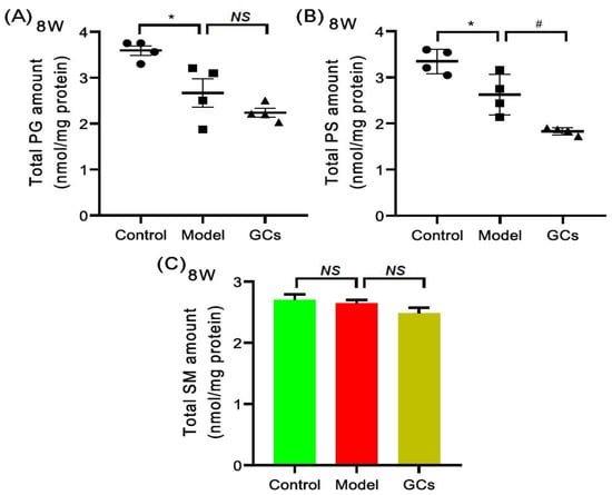 Comparison of the levels of other classes of phospholipids and sphingomyelin species in heart tissues from MRL/lpr mice from each group. Heart tissues of the control (n = 4), model (n = 4), and GCs (n = 4) groups were collected at 8 weeks of age. Both model and GCs group were MRL/lpr mice, while the control group was MRL/MpJ mice. Lipidomics analysis of other classes of phospholipids, including phosphatidylglycerol (PG) and phosphatidylserine (PS) species (Panels A and B) and sphingomyelin (SM) species (Panel C) present in lipid extracts of heart was performed through multidimensional mass-spectrometry-based shotgun lipidomics. The data represent means ± SEM from different groups. Difference between the groups was determined using ANOVA followed by Dunn multiple comparison with IBM SPSS Statistics 19 Software (SPSS Inc., Chicago, IL, USA) after the normality of each group of variables was checked by Q–Q plots. The raw p values were adjusted to false discovery rat using the Benjamini–Hochberg method. * adjusted p < 0.05 and # adjusted p < 0.05 compared with those in the control group and the model group, respectively. NS, not significant.