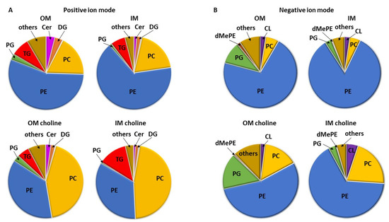 Lipid classes in the OM and IM of L. gormanii grown on a medium with and without the addition of exogenous choline. The lipid classes were analyzed by LC-MS in the positive (A) and negative ion mode (B).