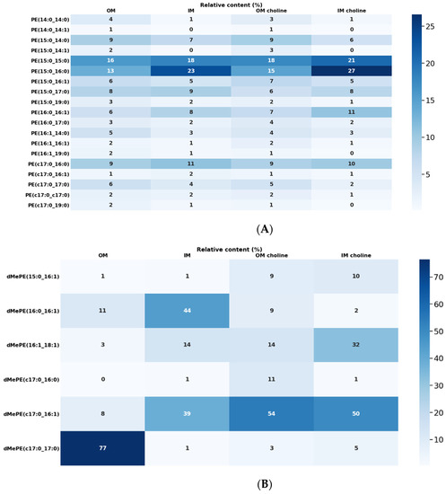 Methylated derivatives of PE were identified as well. The profile of dMePEs showed that the most abundant species were dMePE cyclopropyl17:0_17:0 (77%), dMePE16:0/16:1 (11%) in the OM and dMePE16:0_16:1 (44%), dMePE cyclopropyl17:0_16:1 (39%) in the IM (Figure 3B).
