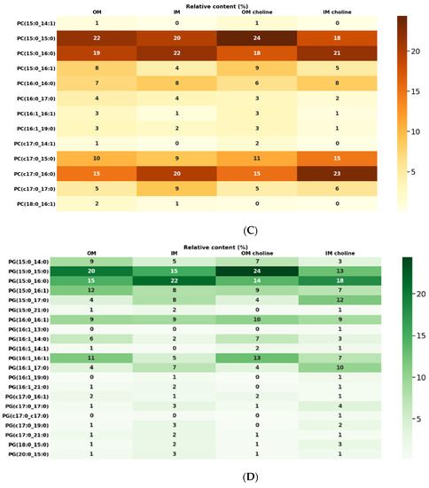 L. gormanii lipids contained also PG, the amount of which in the OM was higher than in the IM and did not change depending on the growth conditions. Twenty-two PG species were identified in both membranes. The major molecular species were composed of 15:0 and 16:0, similar to the PE and PC classes (Figure 3D). However, unlike the PE and PC classes, PG16:1_16:1 was abundant in the OM lipids. The OM lipids contained more PG15:0_15:0, PG16:1_14:0, and PG15:0_14:0 than in the IM, while the IM lipids were characterized by higher amounts of PG15:0_16:0, PG15:0_17:0, and PG16:1_17:0 compared to the OM.