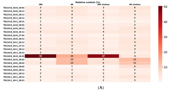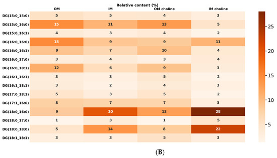Glycerolipids (TG and DG) were the second most abundant fraction of lipids from L. gormanii membranes. TG constituted the most diverse class of lipids including 125 species dominated by TG18:0_16:0_16:0. This lipid comprised approx. 50% of total TG species and was mainly localized in the OM. The other TG species present in significantly smaller amounts were as follows: TG16:0_16:1_18:1, TG15:0_16:0_16:0, TG16:0_16:0_16:1, TG15:0_16:0_18:1, and TG18:0_18:1_18:1. The content of TG18:0_18:0_18:0 was 4% in the OM, and 13% in the IM (Figure 4A). Fatty acids with a hydrocarbon chain length of 16 and 18 were the main acids building of the lipid class. There were no significant differences in the content of TG species between the different growth conditions except for TG18:0_16:0_16:0, which was more than 3 times higher in the IM than the IM choline. However, the amount of TG 18:0_18:0_18:0 was higher in IM compared to IM choline.