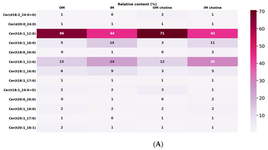 All ceramides were distributed in the OM and IM, but there were clear quantitative differences for some species between the membranes. Among the total 14 ceramides and oxidized ceramides, one species, cer(16:1_12:0), represented approx. 66% of ceramides in the OM and approx. 44% in the IM in the case of the bacteria cultured without exogenous choline. The content of the cer(t16:1_12:0) (71%) species was higher in the OM, but similar in the IM of bacteria cultured with the addition of choline. Cer(t18:1_12:0) was the second most abundant species, which was localized mainly in the IM (24% or 29% IM choline), while its content in the OM was approx. half, regardless of the bacterial culture conditions (Figure 5A).