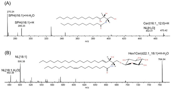 In Figure 6A,B, the fragmentation mass spectra of the most dominant ceramide and hexosylceramide of L. gormanii are shown.