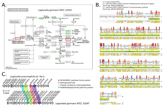 Searching for pathways of sphingolipid metabolism in the genome of L. gormanii ATCC 33297. (A) Mapping the L. gormanii ATCC 33297 genome annotation to the KEGG sphingolipid metabolism pathway map (map00600). Chemical compounds are represented as circles, and gene products are represented as rectangles. The two important entry enzymes in the pathway: serine palmitoyltransferase (SPT, EC 2.3.1.50, K00654) and sphingomyelin phosphodiesterase (SMPD1, 3.1.4.12, K12350) are outlined in red. Green rectangles represent enzymes found in the genome of L. gormanii ATCC 33297 via KofamKOALA and with assigned KO identifiers. For the first step of sphingolipid synthesis, i.e., condensation between serine and the acyl-CoA thioester, no SPT enzyme was found in the L. gormanii ATCC 33297 genome, based on the standard thresholds for KO identification. However, there are sequences encoding SPT protein homologues (8-amino-7-oxononanoate synthase, locus tag: A8O30_RS00250; 2-amino-3-oxobutyrate coenzyme A ligase, locus tag: A8O30_RS04185) present, belonging to the bacterial α-oxoamine synthases family. In the case of SMPD1, which catalyzes the breakdown of sphingomyelin into ceramide and phosphatidylcholine, although KO identification failed to assign this function, the homologue of predicted sphingomyelinase encoded by the lpp2641 L. pneumophila str. Paris gene with a level of identity of 61% was found in the L. gormanii ATCC 33297 genome. (B) Multiple protein sequence alignment of reference bacterial SPT from Sphingomonas paucimobilis (Q93UV0_SPHPI) and SPT homologues present in the genome of L. gormanii ATCC 33297. The color-coded bar at the top indicates the conservation degree. Below, there is the consensus sequence. In addition, the recognized Pfam domain (Pfam_Aminotran_1_2) is marked with a green rectangle, which indicates the presence of certain mechanistic features, such as the covalent binding of the pyridoxal-phosphate group to a lysine residue. The level of identity between Sphingomonas paucimobilis SPT and L. gormanii ATCC 33297 homologues is at the level of 30%. The alignment was generated using the Multiple Sequence Comparison by Log-Expectation (MUSCLE) algorithm in SnapGene (GSL Biotech). (C) Comparison of genomic regions encoding SMPD1 between in L. pneumophila str. Paris and L. gormanii ATCC33297. The individual coding sequences are marked with arrows according to their orientation. Above is the locus tag for the individual coding sequence in the GenBank database. The color lines joining the two regions indicate the level of identity above the designated threshold (0.22) for specific proteins. There are four CDSs with significant similarity within the analyzed regions coding for SGNH/GDSL hydrolase (violet), sphingomyelinase (red), D-alanyl-D-alanine carboxypeptidase (green), and ParB partition protein (green). This may indicate a common evolutionary origin of SMPD1 in these species. The comparison and visualization were made using the clinker tool.