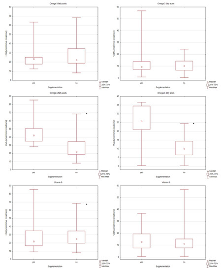 Box and Whisker plots for compounds determined in supplementation-categorized children with autism group (omega-3 and omega-6 fatty acids, vitamins B). In these box plots, medians inside the 25–75% interquartile range (IQR) are presented. *—statistically significant with p-value < 0.05.
