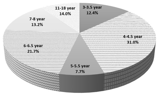 129 subjects participated in the study (120 boys and 9 girls). The age range of the study participants was 3–18 years. Age characteristics of the study population are presented in Figure 4.
