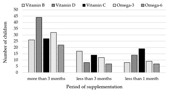 The duration of supplementation with a given supplement was different for each child. The children could be divided into the following three groups: supplemented for more than 3 months, less than 3 months and supplemented less than 1 month. Data on the consumed supplements and the duration of supplementation are presented in Figure 5. Additional graphs showing data on vitamin B and D intake with specification of vitamin type, doses used and duration of supplementation are presented in the Supplementary Materials (Figures S3 and S4).