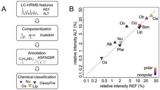 - Kuhl, C.; Tautenhahn, R.; Böttcher, C.; Larson, T.R.; Neumann, S. CAMERA: An Integrated Strategy for Compound Spectra Extraction and Annotation of Liquid Chromatography/Mass Spectrometry Data Sets. Anal. Chem. 2012, 84, 283–289. [Google Scholar] [CrossRef] [Green Version]